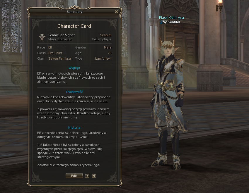 Karty PostaciDołącz do nas i napisz swoją własną legendę! To hasło widzi każdy wchodzący na naszą stronę i od teraz każdy może to dosłownie zrealizować w grze! Dodaliśmy Karty Postaci dzięki którym możecie opowiedzieć historię swojej postaci innym graczom. Znajdziecie tam siedem sekcji: Wygląd, Osobowość, Historia, Cytaty, Fakty, Plotki i Ciekawostki umożliwiające zamieszczenie tekstu w języku angielskim i polskim nawet do 1500 znaków. Poza tym na kartach poznacie pełną nazwę postaci, dowiecie się czy to główna czy alternatywna postać, jaki gracz jest aktualnie na postaci i jakim językiem się posługuje oraz rasę, klasę, klan, płeć, wiek i uproszczony typ charakteru. Karty możecie przeglądać nawet dla niezalogowanych postaci!